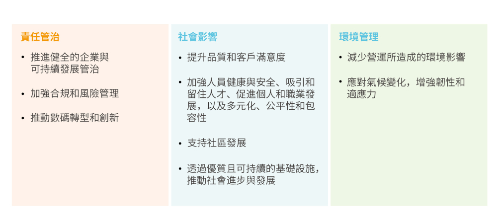 作為企業責任的重要一環,我們的可持續發展方針以三大策略支柱作為基礎:責任管治、社會影響及環境管理,展示了我們對企業管治、人才發展、社會責任及環境保護的堅定承擔。